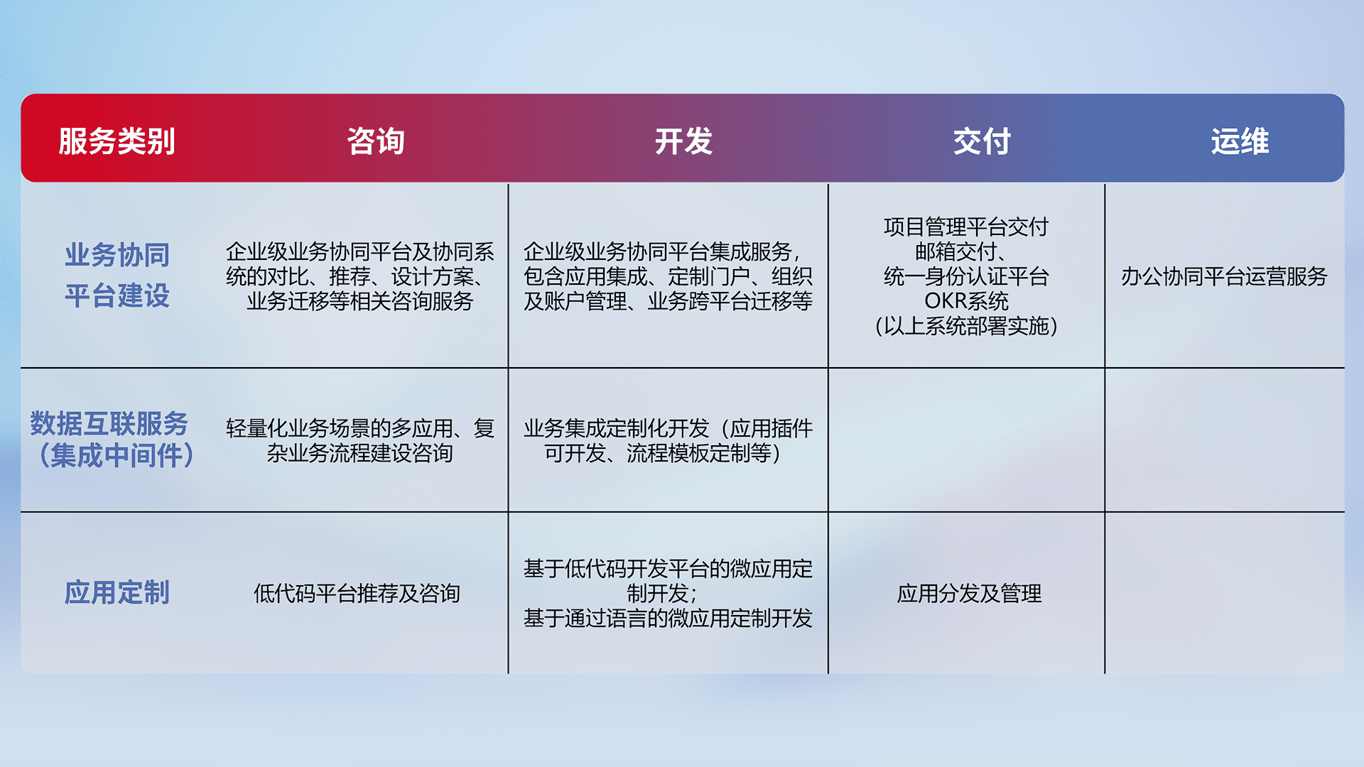 针对钉钉、、、企微、、、、IDaas等平台级产品提供产品的规划、、、方案、、、、交付、、、、定制化开发等服务,,,,实现如统一协同办公、、、、智能客户服务、、、混合会议管理、、智能数据查询、、等业务场景,,实现数字化转型。。。。